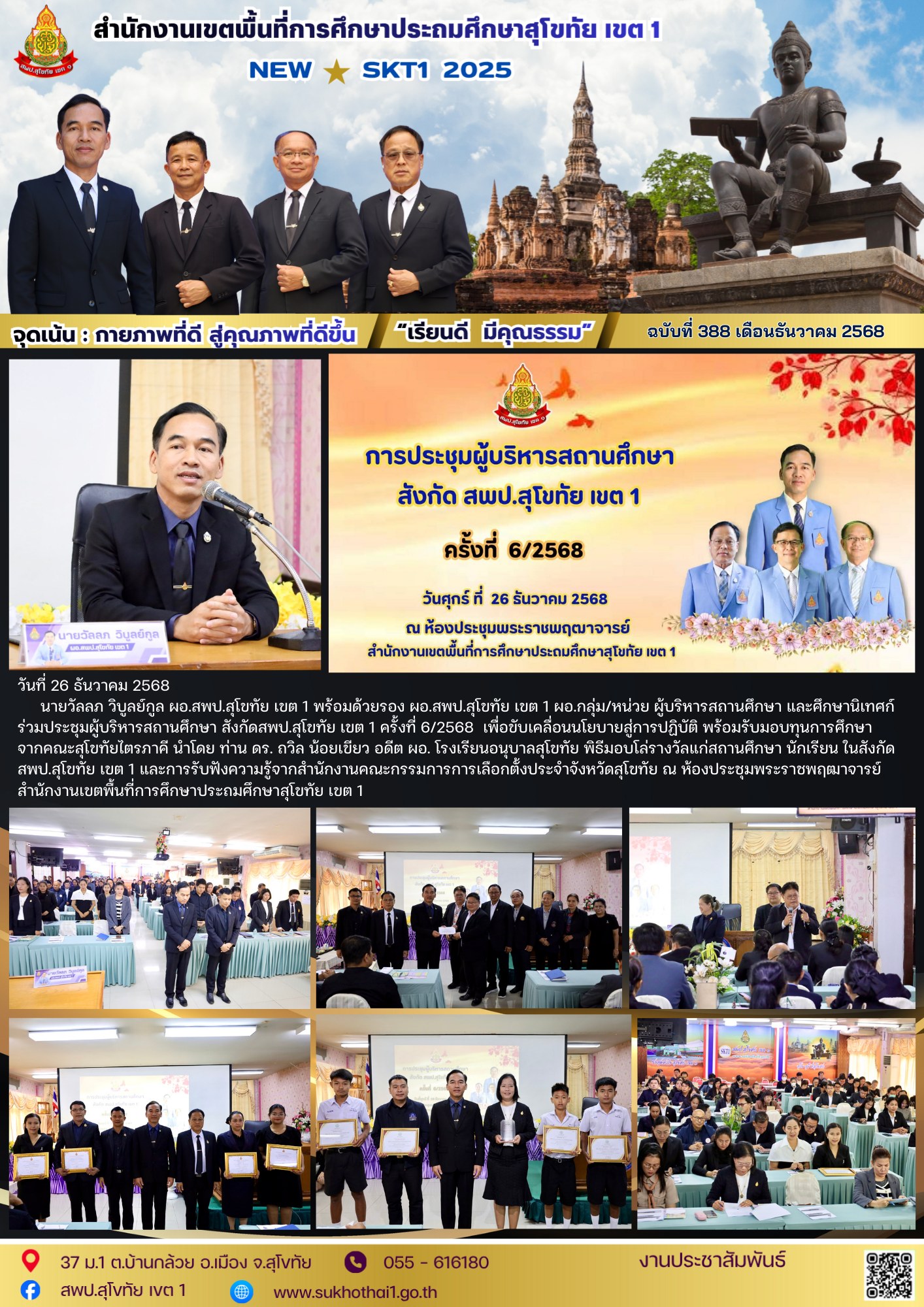 นายวัลลภ วิบูลย์กูล ผอ.สพป.สุโขทัย เขต 1 พร้อมด้วยรอง ผอ.สพป.สุโขทัย เขต 1 ผอ.กลุ่ม/หน่วย ผู้บริหารสถานศึกษา และศึกษานิเทศก์ ร่วมประชุมผู้บริหารสถานศึกษา สังกัดสพป.สุโขทัย เขต 1 ครั้งที่ 6/2568 เพื่อขับเคลื่อนนโยบายสู่การปฏิบัติ พร้อมรับมอบทุนการศึกษาจากคณะสุโขทัยไตรภาคี นำโดย ท่าน ดร. ถวิล น้อยเขียว อดีต ผอ. โรงเรียนอนุบาลสุโขทัย พิธีมอบโล่รางวัลแก่สถานศึกษา นักเรียน ในสังกัด สพป.สุโขทัย เขต 1 และการรับฟังความรู้จากสำนักงานคณะกรรมการการเลือกตั้งประจำจังหวัดสุโขทัย ณ ห้องประชุมพระราชพฤฒาจารย์ สำนักงานเขตพื้นที่การศึกษาประถมศึกษาสุโขทัย เขต 1