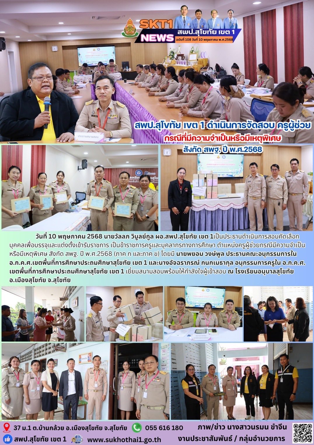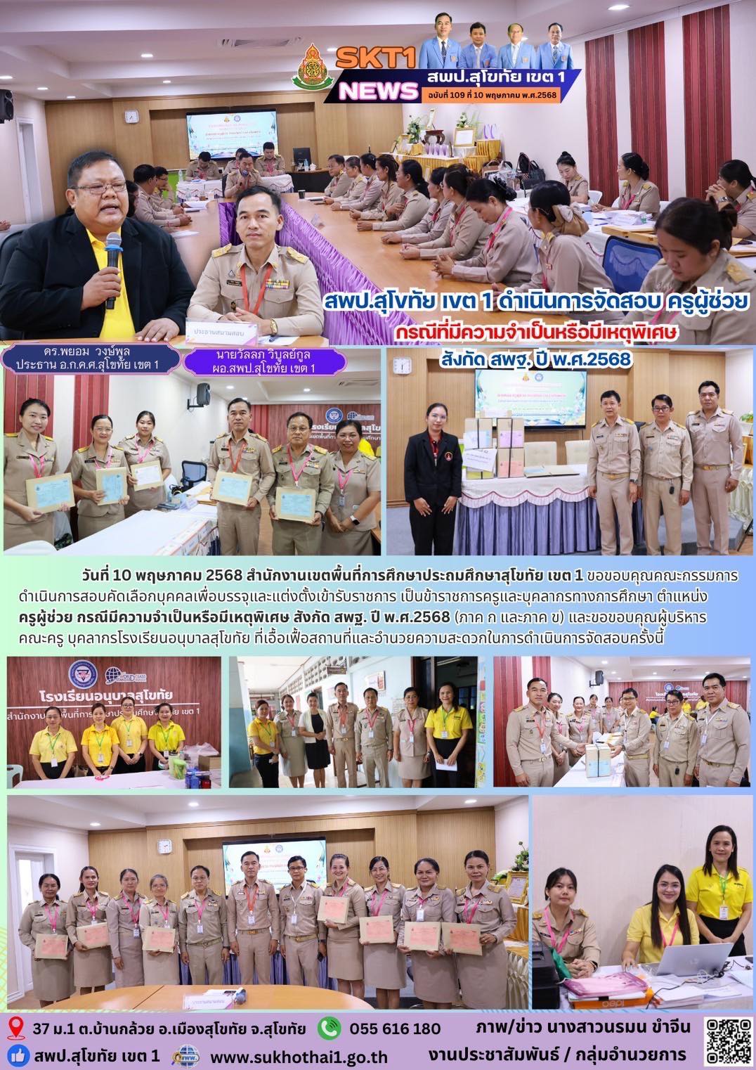 วันเสาร์ที่ 10 พฤษภาคม 2568 สำนักงานเขตพื้นที่การศึกษาประถมศึกษาสุโขทัย เขต 1 นำโดย นายวัลลภ วิบูลย์กูล ผอ.สพป.สุโขทัย เขต 1 พร้อมด้วย รอง ผอ.สพป.สุโขทัย เขต 1 นางรัตนา เสนาพิทักษ์ ผอ.กลุ่มบริหารงานบุคคล และบุคลากรที่เกี่ยวข้อง ร่วมดำเนินการคัดเลือกบุคคลเพื่อบรรจุและแต่งตั้งเข้ารับราชการในตำแหน่ง ครูผู้ช่วย กรณีที่มีความจำเป็นหรือมีเหตุพิเศษ สังกัดสำนักงานคณะกรรมการการศึกษาขั้นพื้นฐาน (สพฐ.) ปี พ.ศ. 2568 ภายใต้บรรยากาศที่โปร่งใส เป็นธรรม และยึดหลักคุณธรรม พร้อมทั้งดำเนินการตามระเบียบและแนวทางที่ สพฐ. กำหนด เพื่อคัดเลือกครูผู้ช่วยที่มีคุณภาพเข้าสู่ระบบการศึกษาอย่างมีประสิทธิภาพ ณ สนามสอบ สพป.สุโขทัย เขต 1 โรงเรียนอนุบาลสุโขทัย อ.เมืองสุโขทัย จ.สุโขทัย โดยมี นายพยอม วงษ์พูล ประธาน อ.ก.ค.ศ.เขตพื้นที่การศึกษาประถมศึกษาสุโขทัย เขต 1 และคณะ อ.ก.ค.ศ.เขตพื้นที่การศึกษาฯ ตรวจเยี่ยมพร้อมให้กำลังใจผู้เข้าสอบและคณะกรรมการฯ