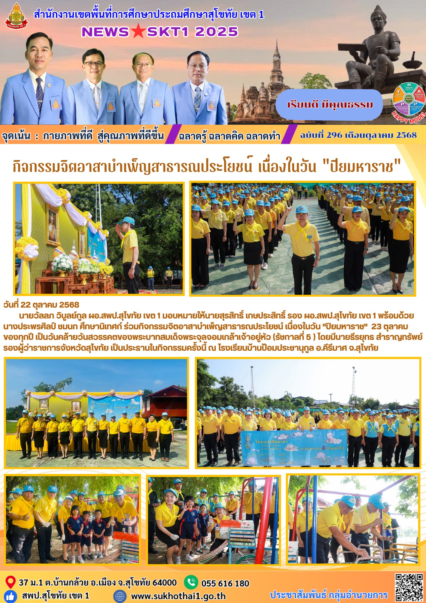 นายวัลลภ วิบูลย์กูล ผอ.สพป.สุโขทัย เขต 1 มอบหมายให้นายสุรสิทธิ์ เกษประสิทธิ์ รอง ผอ.สพป.สุโขทัย เขต 1พร้อมด้วยนางประพรศิลป์ ชมนก ศึกษานิเทศก์ ร่วมกิจกรรมจิตอาสาบำเพ็ญสาธารณประโยชน์ เนื่องในวัน "ปิยมหาราช" 23 ตุลาคม ของทุกปี เป็นวันคล้ายวันสวรรคตของพระบาทสมเด็จพระจุลจอมเกล้าเจ้าอยู่หัว (รัชกาลที่ 5 ) โดยมีนายธีรยุทธ สำราญทรัพย์ รองผู้ว่าราชการจังหวัดสุโขทัย เป็นประธานในกิจกรรมในครั้งนี้ ณ โรงเรียนบ้านป้อมประชานุกูล อ.คีรีมาศ จ.สุโขทัย