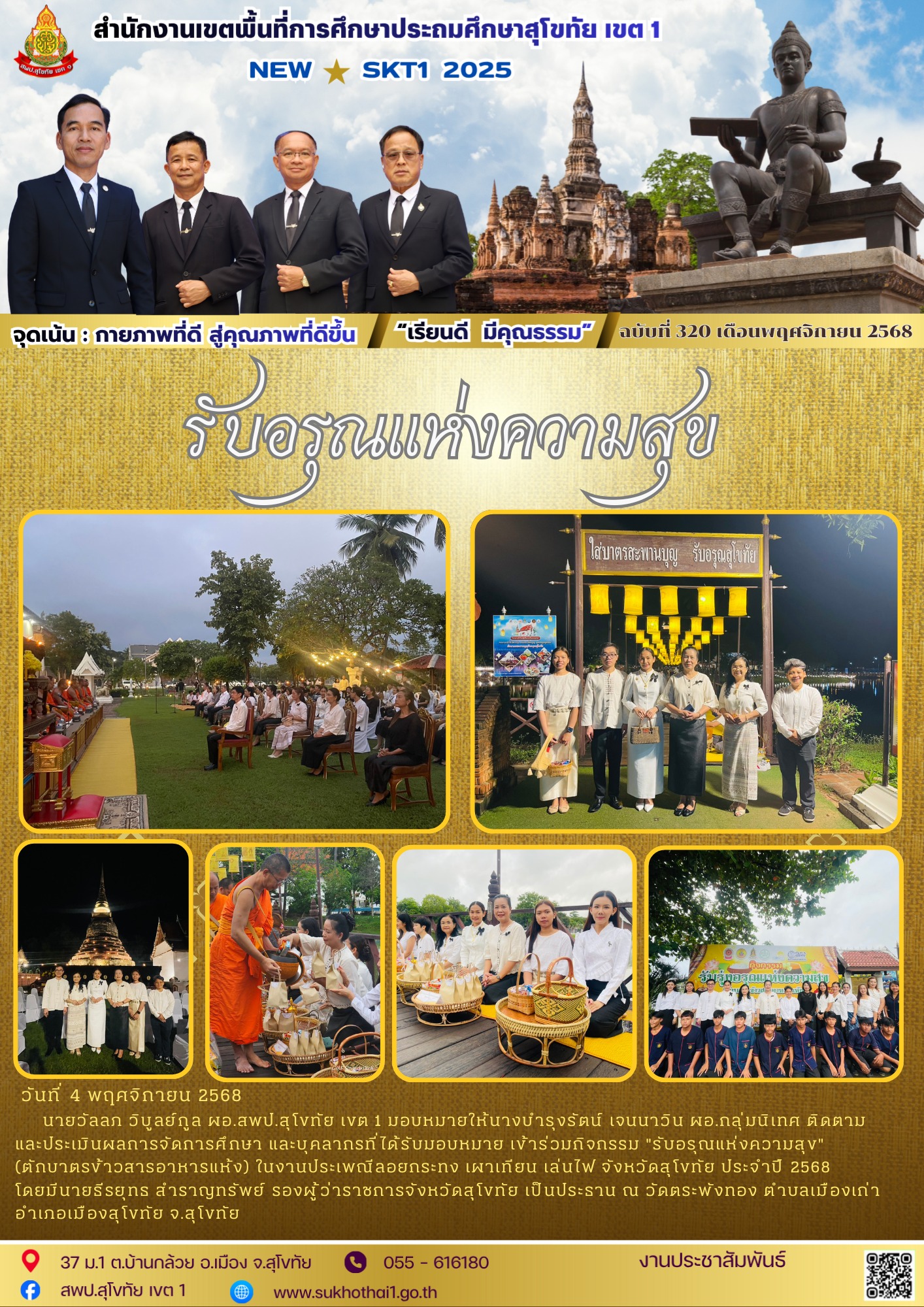 นายวัลลภ วิบูลย์กูล ผอ.สพป.สุโขทัย เขต 1 มอบหมายให้นางบำรุงรัตน์ เจนนาวิน ผอ.กลุ่มนิเทศ ติดตาม และประเมินผลการจัดการศึกษา และบุคลากรที่ได้รับมอบหมาย เข้าร่วมกิจกรรม "รับอรุณแห่งความสุข"