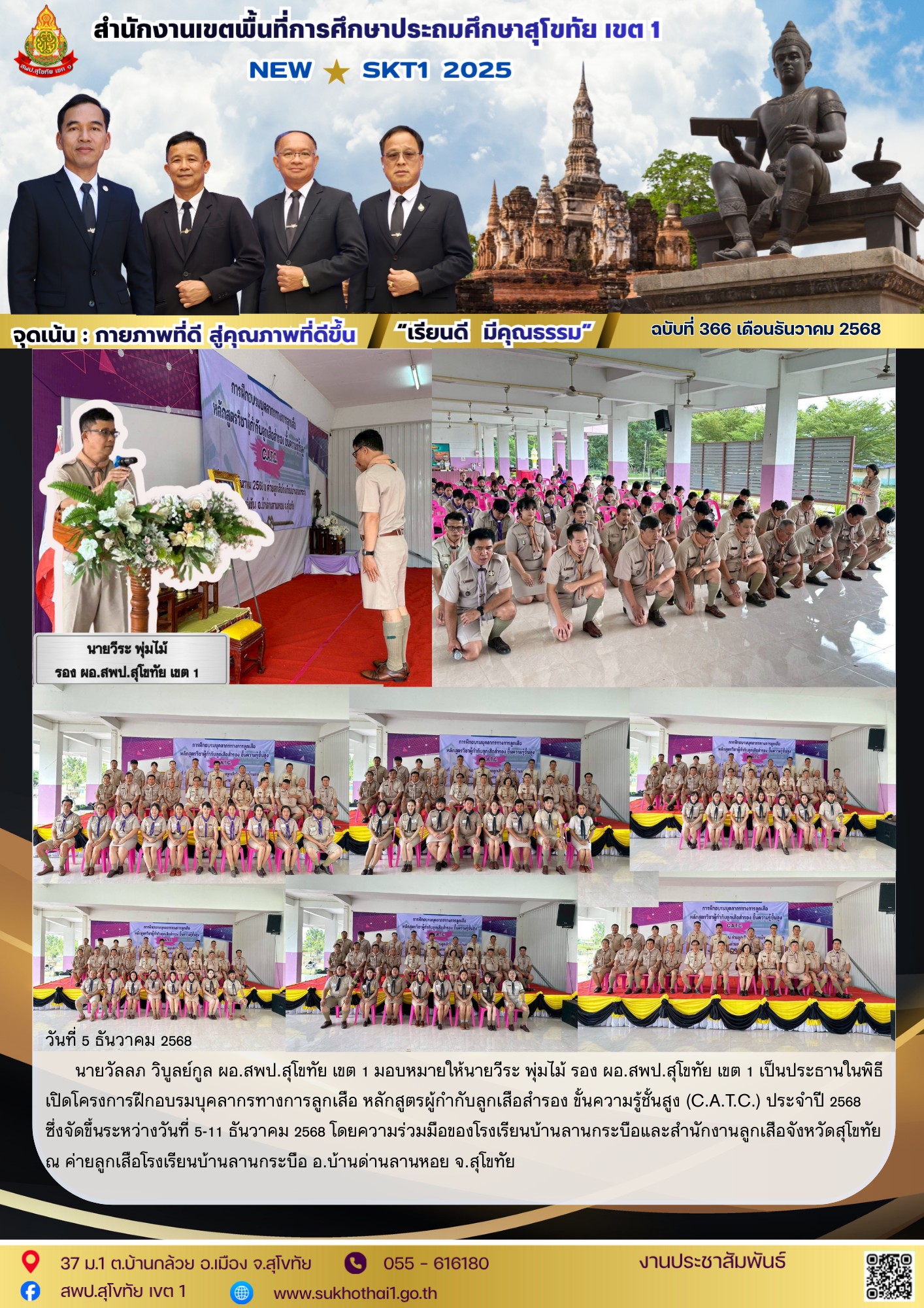 นายวัลลภ วิบูลย์กูล ผอ.สพป.สุโขทัย เขต 1 มอบหมายให้นายวีระ พุ่มไม้ รอง ผอ.สพป.สุโขทัย เขต 1 เป็นประธานในพิธีเปิดโครงการฝึกอบรมบุคลากรทางการลูกเสือ หลักสูตรผู้กำกับลูกเสือสำรอง ขั้นความรู้ชั้นสูง (C.A.T.C.) ประจำปี 2568 ซึ่งจัดขึ้นระหว่างวันที่ 5-11 ธันวาคม 2568 โดยความร่วมมือของโรงเรียนบ้านลานกระบือและสำนักงานลูกเสือจังหวัดสุโขทัย ณ ค่ายลูกเสือโรงเรียนบ้านลานกระบือ อ.บ้านด่านลานหอย จ.สุโขทัย